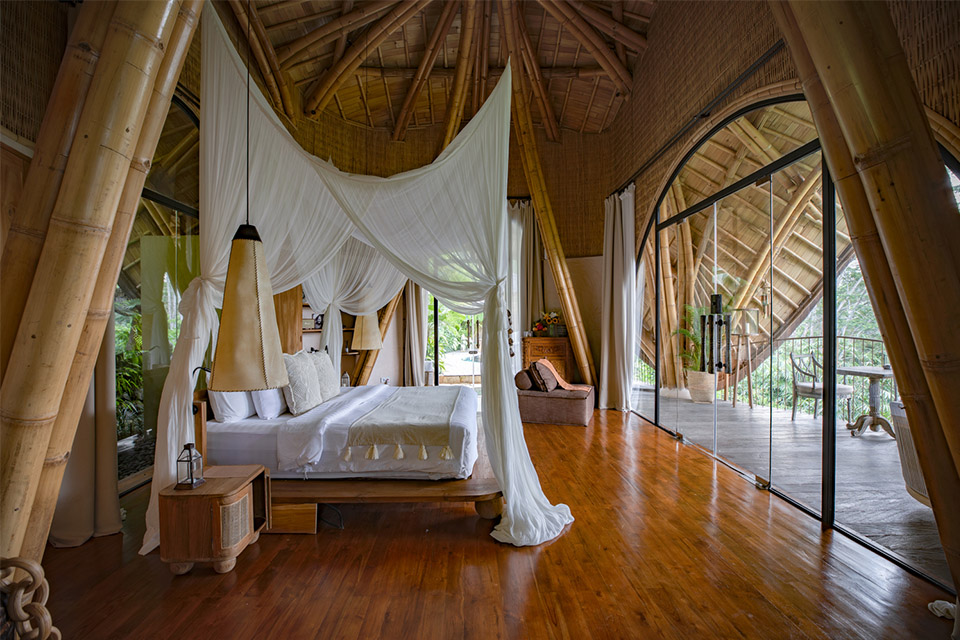 室内氛围宁静祥和,令人神清气爽。阳光透过竹编,微风拂过室内,山谷和丛林的景致一览无余。穹顶别墅既是休憩之所,也是焕然一新的场所,建筑、景观和工艺相得益彰,滋养身心,呵护环境。