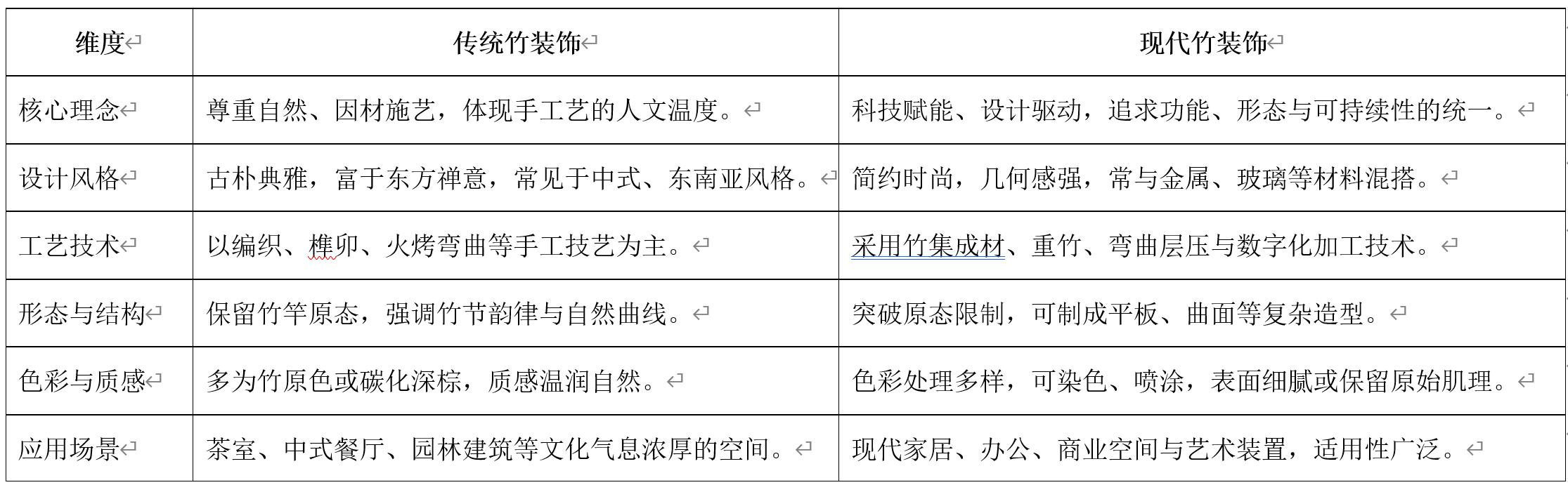 传统竹装饰与现代竹装饰在理念、形式、技术和应用上存在显著差异,各自展现出独特的审美取向与功能特点。